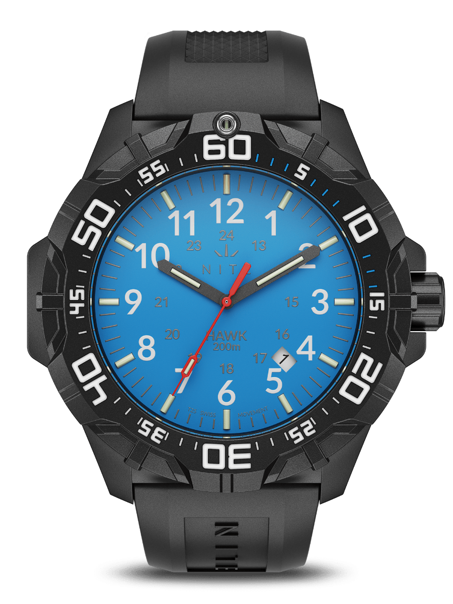 Meet the HAWK AZURE a limited edition of only 100 watches and the every last two ever available!! Inspired by military heritage and proven by professionals, the HAWK Series from Nite watches stands at the intersection of rugged durability and everyday practicality. Engineered with a strong and lightweight carbon reinforced polycarbonate case, the HAWK AZURE features self-powered tritium illumination that provides a continuous glow, no charging, no batteries, just reliable visibility, day or night. If it sells out it’ll be drawn early!