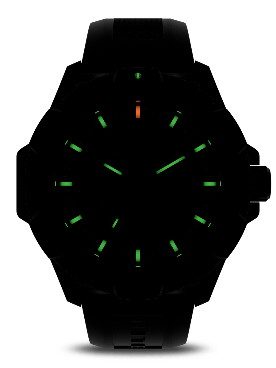 Illumination: T25 green and orange Tritium (GTLS) tubes for constant glow—no charging required